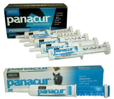 Apple-cinnamon flavored paste is safe for foals, pregnant mares and stallions. For the control of large and small strongyles, pinworms and ascarids. Contains 100 mg fenbendazole per gm. Each 25 gm syringe treats up to 1,100 lbs. For foals and weanlings less than 18 mos of age, use double the dose on a per pound basis. Optional: For control of encysted early 3rd stage, late 3rd stage and 4th stage small strongyle larvae, and 4th stage large strongyle larvae, use the Panacur PowerPac. Contains five 57 gm syringes, 1 each for 5 consecutive days of treatment for a 1,250 lb horse.